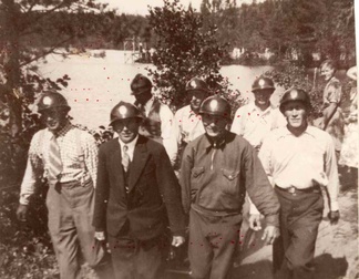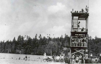 ![]() Kuusjoen VPK:n harjoitukset Levon rannassa 1930-luvulla. | ![]() Alunperin hyppytorni sijaitsi "niekassa". |