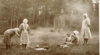 ![]() Uimarannan vanha saunarakennus | ![]() Tiskarlan Prätän heinäväki virkistäytymässä Levon rannalla 1920-luvulla. |