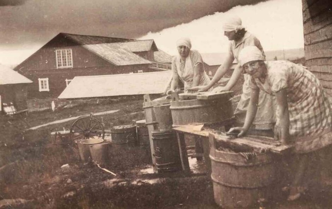 ![]() Pyykkäreitä pyykillä 1920-luvulla Pappilan kylässä. Vasemmalla talon tytär, myöh. emäntä Sylvi Kankaanpää, myöh. Vienonen. Keskellä on Alli Vienonen. |