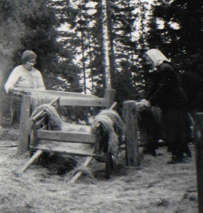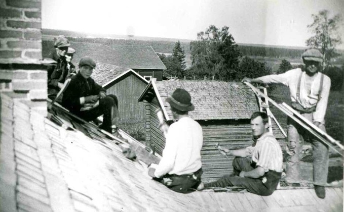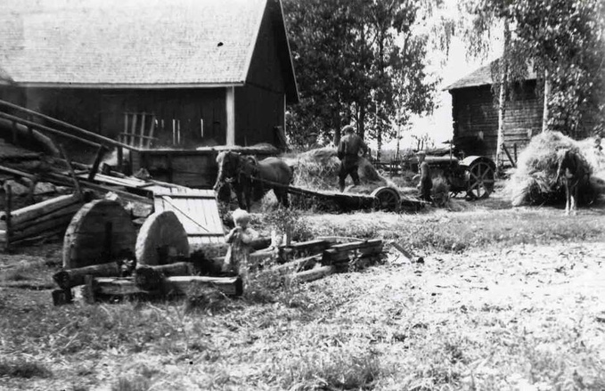 ![]() Heinäväkeä Tiskarlan Haikialla 1930-luvulla. Toinen vasemmalla talon poika Esko Vainio, oikealla Ilmari Kajander. |