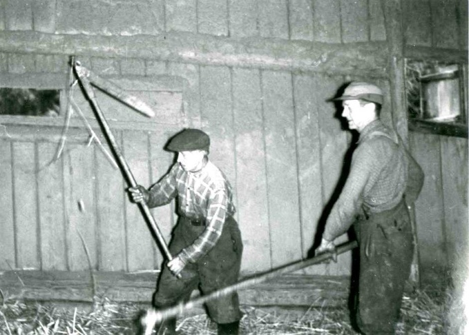 ![]() Rukiinpuinnissa varstat viuhuen Otto Sadonoja ja Niilo Nokka. |