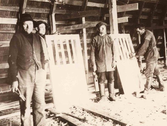 ![]() Vieno Riihikankare ja Reino Eskola tappurissa, pikkupoika Ossi Eskola tikkuhöylän edessä. |