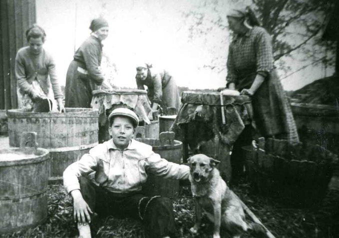 ![]() Perunajauhojen tekoa Kuttilan Haavistossa 1960-luvun alussa. Vasemmalla talon tytär Hilkka Heino, Lyyli Jokela, emäntä Vilma ja Aili Kalliola. Edessä poika Heikki Halli-koiransa kanssa. |