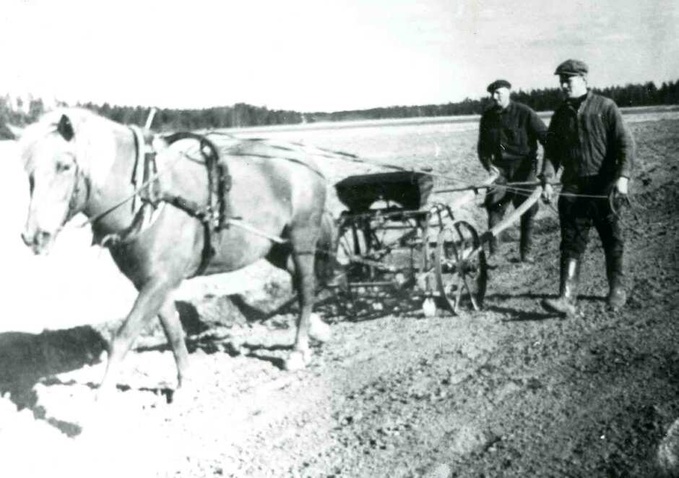 ![]() Rehujuurikkaan kylvöä hevoskoneella Kuttilan Haavistossa 1950-luvulla. Konetta ohjaa isäntä Arvo Heino ja hevosta naapurin poika Jukka Vehmasto. |