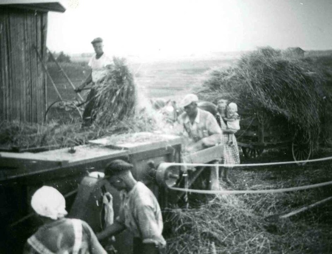 ![]() Viljan puintia öljymoottorilla ja puimakoneella Kuttilan Keto-Isotalossa 1930-luvulla. |